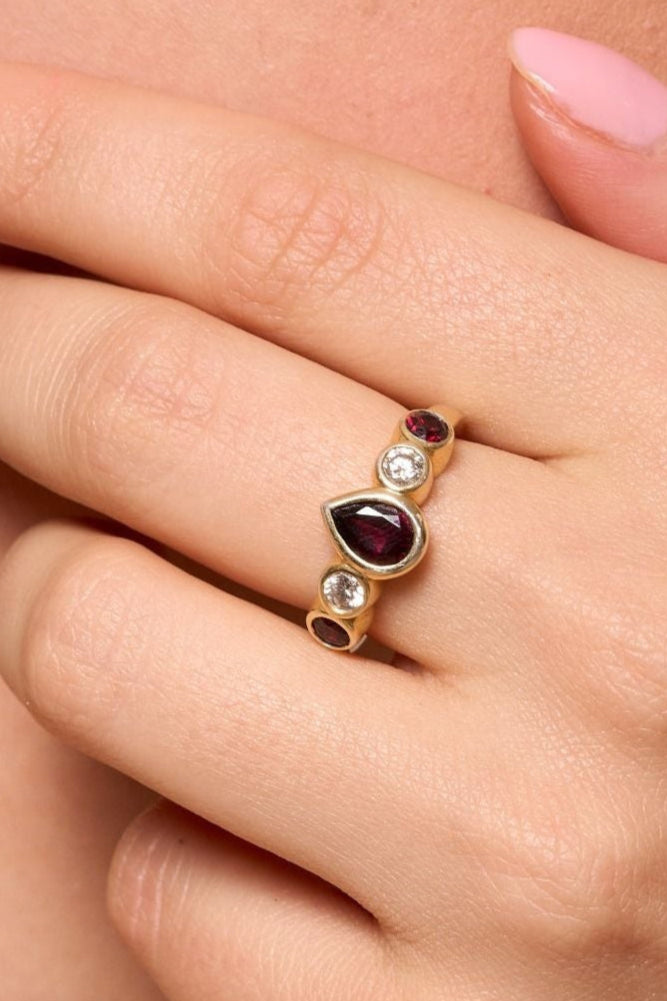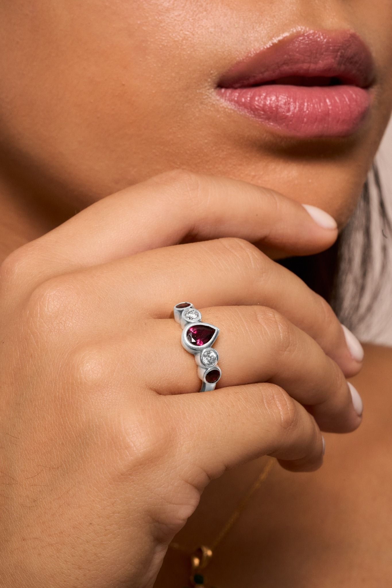 The Vela Ring carries five bezel-set stones like a constellation. At its heart, a pear-cut ruby-red gem descends, framed by a delicate symmetry of smaller stones that echo flame and form. Brilliant, sculptural, and endlessly sophisticated, it catches light unexpectedly.