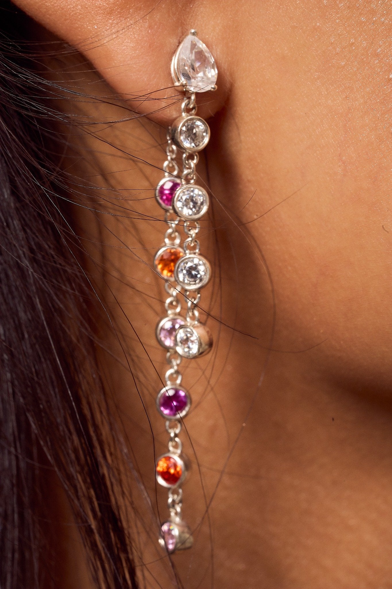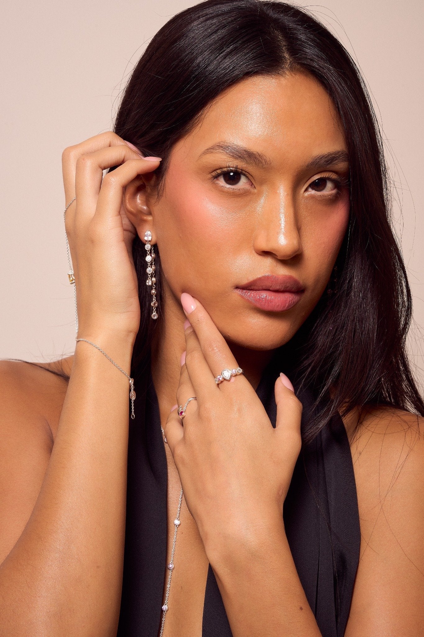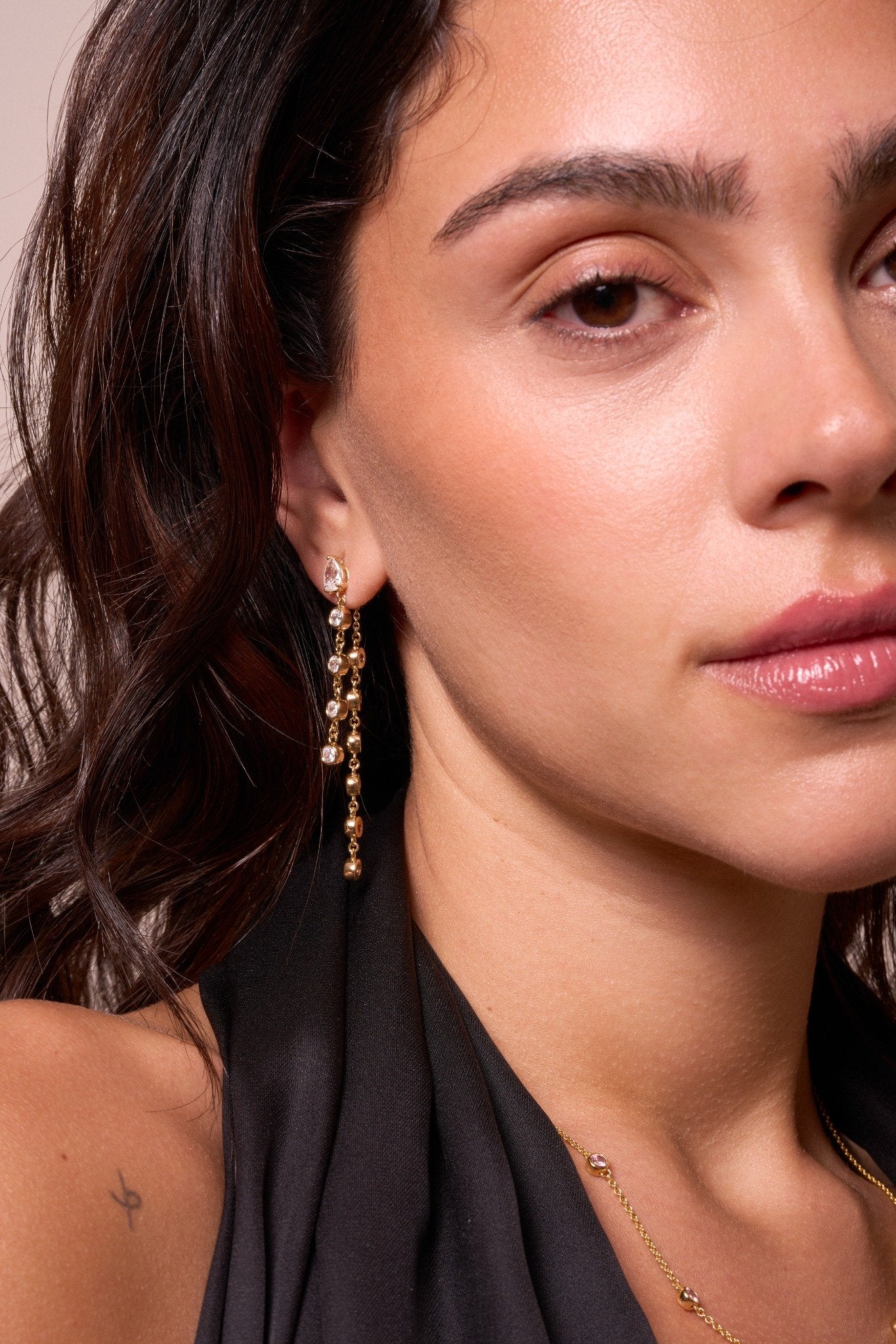A transformatice earring design that can be worn two ways, adorned with a cascade of luminous cubic zirconias.