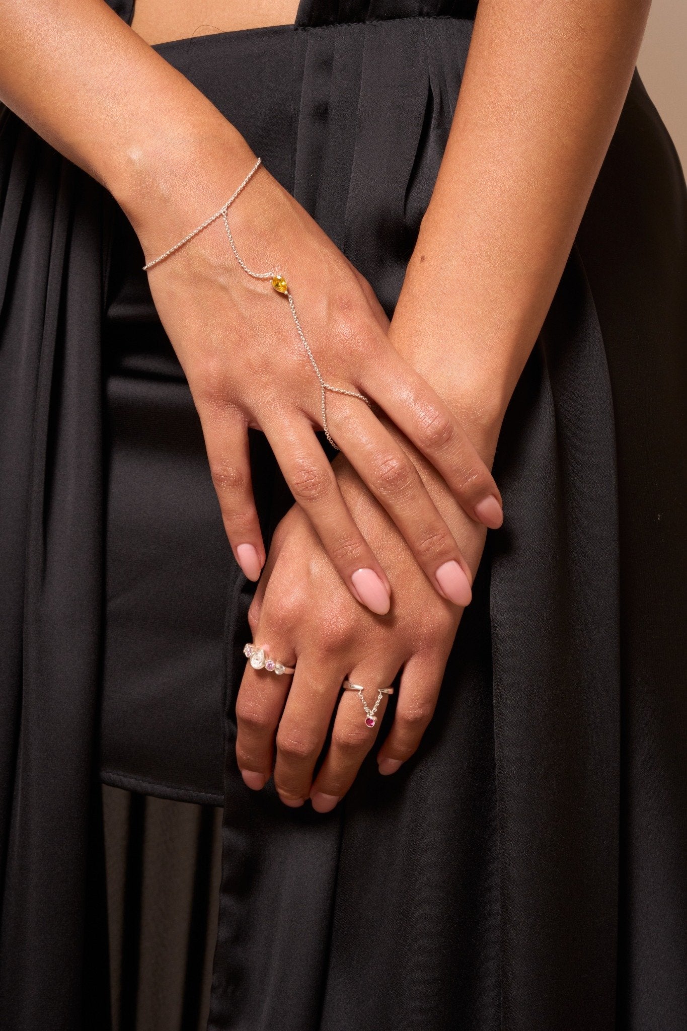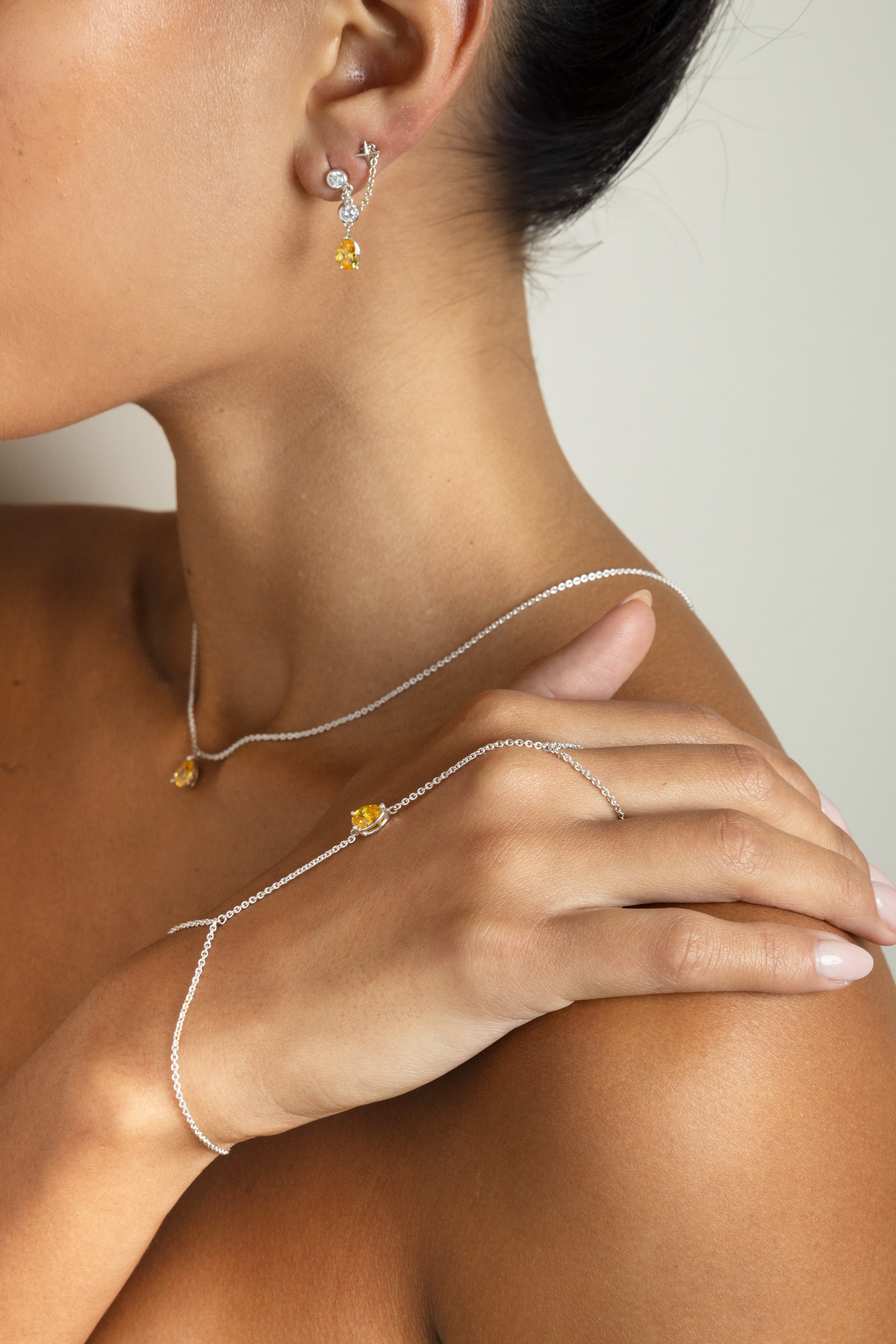 Features a radiant pear-cut solar yellow zirconia.